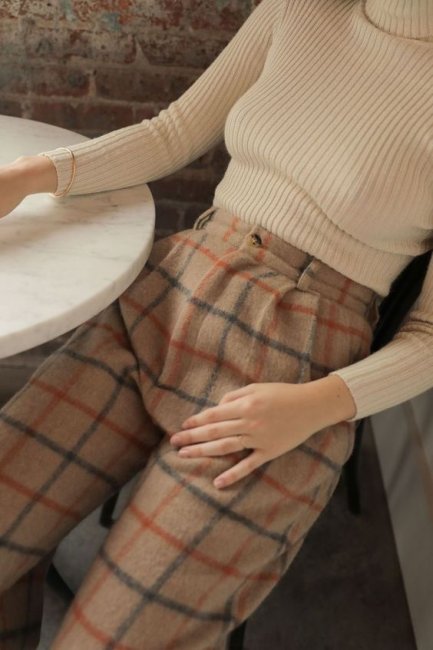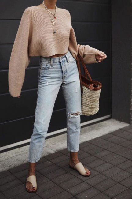 В тренде укороченные модели свитеров. Они не обязательно должны быть в облипку. Это вполне может быть и оверсайз, который заканчивается где-то чуть ниже ребер. Носим с брюками и джинсами, у которых высокая талия.