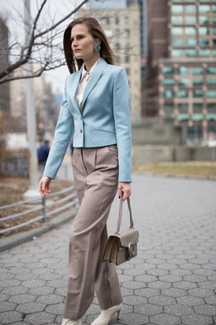 Весной светло-голубой цвет потеснил любимые всеми millennial pink и пастельно-лиловый. В теплое время года освежающий оттенок голубого латте выглядит органично на фоне неба или розового заката. На Неделе моды в Нью-Йорке с лазурным цветом экспериментировали Victoria Beckham, Ralph Lauren, Alexander Wang и звезды streetsyle-хроники. Нежно-голубой хорош и тем, что без проблем впишется в осеннюю палитру — он гармонично сочетается с коричневым, алым и серым. А остаток лета одежду цвета неба можно носить с палитрой белого и бежевого. ELLE выбрал несколько вещей приятного оттенка голубого латте. Сумки Топ Брюки Пиджак Аксессуары