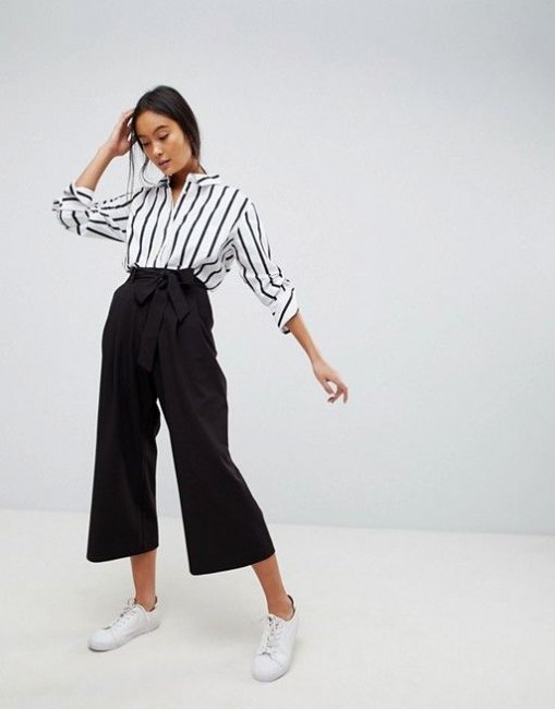 Самое главное — это правильная длина. Брюки такого типа не должны быть слишком длинными. Они должны быть до середины голени примерно, чтобы открывать щиколотку. Именно такая длина удачно смотрится и с плоской подошвой, и с обувью на каблуке. А также позволяет носить кюлоты с закрытой обувью, облегающей голень. Например, с ботинками на шнуровке. Более длинные модели смотрятся странно. Для укороченных брюк они слишком длинные. Для полномерных — слишком короткие. Даже с обувью на каблуке, как на этой картинке, выглядят сомнительно. Что уж говорить про плоскую подошву.