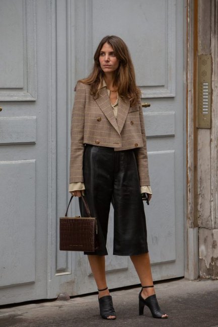 Я очень люблю различные кюлоты, бермуды и прочие варианты брюк свободного кроя. Даже если они совсем выйдут из моды, кажется, я теперь не разлюблю их никогда. По крайней мере уже за то, что эта модель лучше всего садится на фигуру с большим перепадом между бедрами и талией.Многие боятся носить брюки такого типа, мол они портят фигуру и укорачивают ноги. Я решила в этом посте собрать главные ошибки, которые действительно могут испортить ваш образ и сломать пропорции. Самое главное — это правильная длина. Брюки такого типа не должны быть слишком длинными. Они должны быть до середины голени примерно, чтобы открывать щиколотку. Именно такая длина удачно смотрится и с плоской подошвой, и с обувью на каблуке. А также позволяет носить кюлоты с закрытой обувью, облегающей голень. Например, с ботинками на шнуровке. Более длинные модели смотрятся странно. Для укороченных брюк они слишком длинные. Для полномерных — слишком короткие. Даже с обувью на каблуке, как на этой картинке, выглядят сомнительно. Что уж говорить про плоскую подошву. В кюлотах очень важна линия талии. Именно она является центральной точкой образа, своеобразной точкой отсчета, от которой глаз наблюдателя и выстраивает визуально ваши пропорции. Слишком длинный верх, закрывающий линию талии — сразу «утяжеляет» образ, и делает его несколько приземистым. Скажем так, это не критичная ошибка. И иногда я сознательно иду на это ради ощущения динамичности и свободы, правда, в многослойных образах, где все как бы «струится и стекает». Или же с обувью на высоком каблуке. В целом же гораздо лучше, когда у кюлотов будет видимая или даже подчеркнутая линия талии Из предыдущего пункта следует, что кюлоты не стоит выбирать такие, у которых линия талии как бы приспущена. Важности линии талии касается и правило подбора верха таким образом, чтобы он не закрывал талию и не создавал «прямоугольный» силуэт. Исключение — жакеты и жилеты оверсайз, по которым мы изначально понимаем, что они удлиненные и их кроя нарочито свободный. В кюлотах акцент попадает на щиколотку. Поэтому не надо никаких необычных и сложных решений тут. Вот эта шнуровка на фоне голой кожи все портит. Подбирайте к брюкам такого плана либо открытую обувь без лишних деталей, либо же закрытые ботильоны или сапоги, плотно облегающие ногу. Тоже без декора и объемных элементов, зрительно «разбивающих» этот участок.