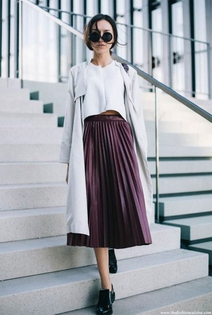 Плиссе или юбка в складочку – это модель, которая не выходит из моды. Длину юбки каждая девушка может выбрать индивидуально. Высоким девушкам подойдут длинные юбки. Единственная тонкость – широкая складка придаст объем бедрам. Следовательно, если девушка немного полновата, ей надо выбирать узенькую складку.