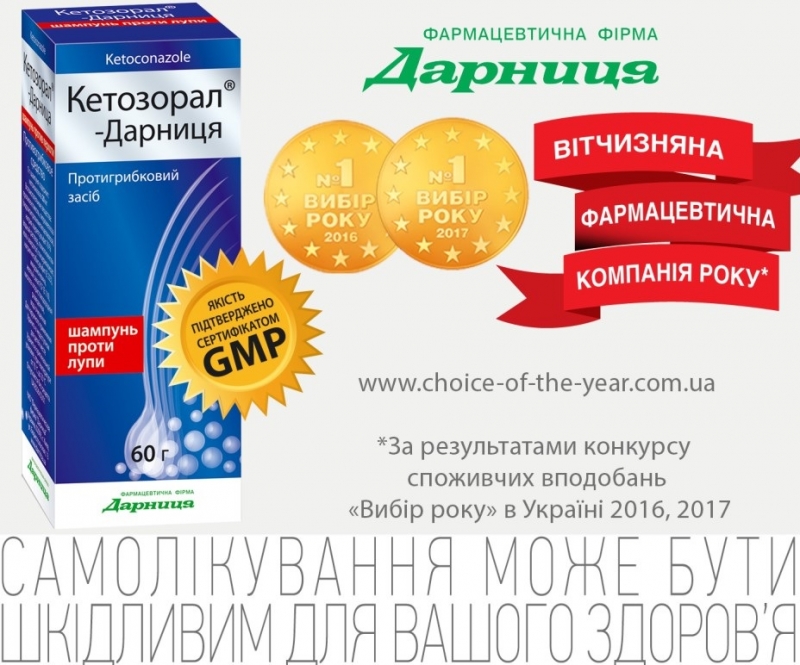 Кетозорал®-Дарниця виробництва ПрАТ «Фармацевтична фірма «Дарниця». Реклама лікарського засобу. В даному рекламному сюжеті використовувалися рекламні слогани. Реєстраційне посвідчення МОЗ України № UA/8226/02/01, від 30.05.2013. Ліцензія Серія АВ №598086. Відпускається без рецепта. Перед застосуванням лікарського засобу необхідно обов’язково проконсультуватися з лікарем та обов’язково ознайомитись з інструкцією для медичного застосування препарату. Зберігати у недоступному для дітей місці. Діюча речовина – Ketoconazole (Кетоконазол). Препарат має протипоказання. Досвід застосування препарату для дітей відсутній.