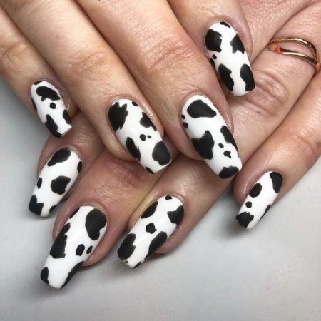 Расцветка "буренка" весьма трендовая в современном маникюре. Конечно, она подойдет девушке без комплексов и с чувством юмора.
