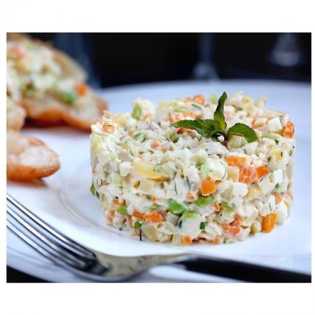 Готовое блюдо можно украсить веточками зелени и подавать на стол. Ваша семья наверняка по достоинству оценит ваши старания и отметит потрясающий вкус этого оливье. Приятного аппетита и веселого празднования Нового года!