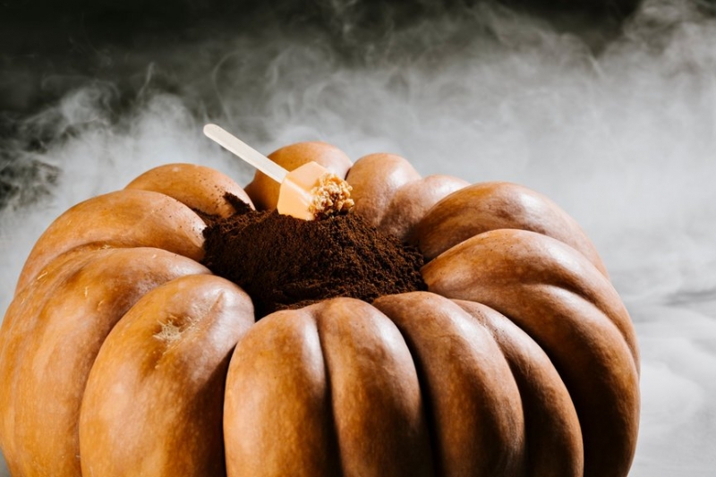 Мы предлагаем вам воспользоваться этими необычными рецептами, благодаря которым вы сможете удивить своих друзей и близких во время Хэллоуина. Рецепт Кубиков из тыквы в кофейном креме от Lavazza: Шаг 1. Приготовьте кофейный крем 340 г сливок112 г молока135 г яичных желтков90 г сахарной пудры200 г молочного шоколада30 мл эспрессо Lavazza 3,5 г желатинаСмешать желтки, сахар, молоко и сливки, нагревать на водяной бане 10 минут. Убрать с огня, добавить шоколад и кофе, перемешать миксером, поставить в холодильник на 4° C. Как только смесь начнет твердеть, с помощью кондитерского мешка залить на дно формы для кубиков и поставить в морозильник.Шаг 2. Подготовьте засахаренную тыквуСмешать 500 мл воды и 500 г сахара, довести в кастрюле до кипения, нарезать кубиками 200 г мякоти тыквы, опустить кубики в получившийся сироп, варить 15 минут. Выключить огонь и оставить охлаждаться в кастрюле. На следующий день достать тыкву, дать стечь лишнему сиропу, дать просохнуть. Шаг 3. Приготовьте крем Маскарпоне 250 г сливок60 г яичных желтков40 г сахара1 щепотка соли6 г желатина250 г маскарпонеСмешать желтки, сахар, соль и сливки, на водяной бане нагреть до 80° C. Снять с огня, добавить желатин. Перемешать и добавить маскарпоне. Оставить в холодильнике на 24 часа, взбивать миксером 5 минут.Шаг 4. Приготовьте кубикиВозьмите форму для кубиков с кофейным кремом и заполните кремом маскарпоне, добавляя кусочки засахаренной тыквы и крошку из макарунов. Поставьте в морозильник.Шаг 5. Форма для кубиков и глазурь 200 г белого шоколада1 г оранжевого пищевого красителя для шоколада.Растопить шоколад и смешать с красителем. Перемешивать две минуты. Быстро окунуть каждый замороженный кубик крема в глазурь. Вставить палочку от мороженного и поместить на гору из бисквитных крошек. Рецепт десерта