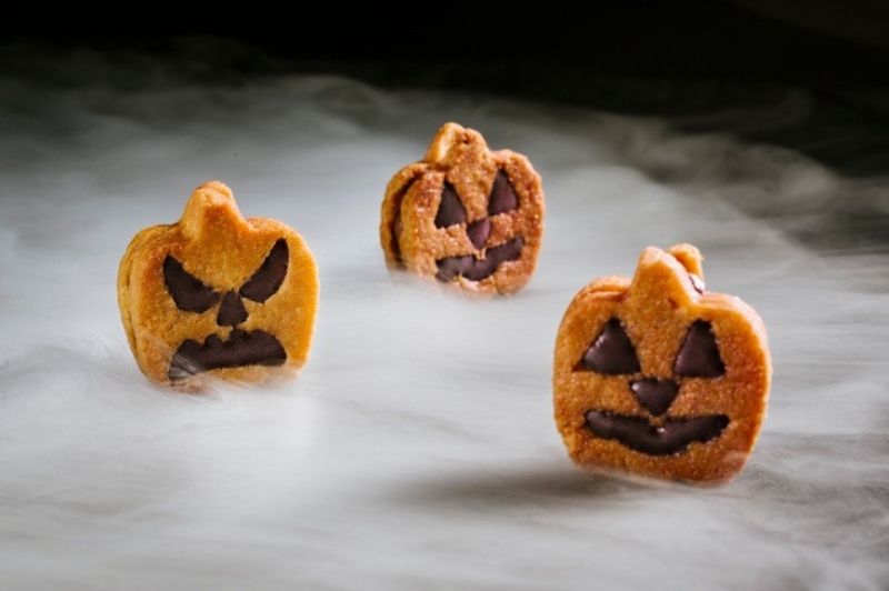 Рецепт десерта "Ждем полуночи"Шаг 1. Приготовьте миндальный бисквит300 г сливочного масла200 г сахара75 г яичных желтков250 г муки100 г крахмала100 г миндальной муки0,5 г ванили10 г молотого кофе LavazzaПеремешать размягченное масло с сахаром и ванилью при помощи лопатки, добавить желтки, в последнюю очередь добавить оба вида муки, ваниль и молотый кофе. Быстро перемешать, перелить смесь в кондитерский мешок, сделать печенье в форме тыквы. Выпекать при 170° C примерно 10 минут.