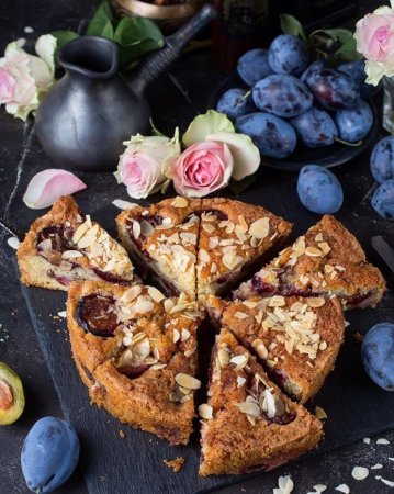 ТОРТ СО СЛИВАМИИнгредиенты:Сливочное масло 130 гр (комнатной температуры)Сахар 100 гр Яйцо куриное 2 штМука 1 стакан Разрыхлитель 7 грСпеции 1,5 ч. л.Соль щепотка Миндальные лепестки немного для посыпки Сливы 14-16 штук (жесткие и кисловатые)