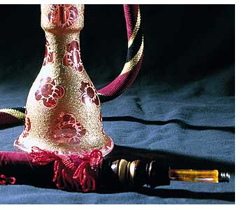 Неудивительно, что турки не упустили случая использовать этот материал для изготовления кальянов. Персидский фарфоровый сосуд для воды был заменён на колбу, сделанную из стамбульского стекла или горного хрусталя. К персидскому нововведению — матерчатому шлангу — турки добавили мундштук, который изготавливался из дерева или янтаря. Верхушки кальянов, которым прежде не уделялось особого внимания, в Турции стали делать из меди или серебра. Их украшали не только резьбой, но и драгоценными камнями, хрустальными вставками.