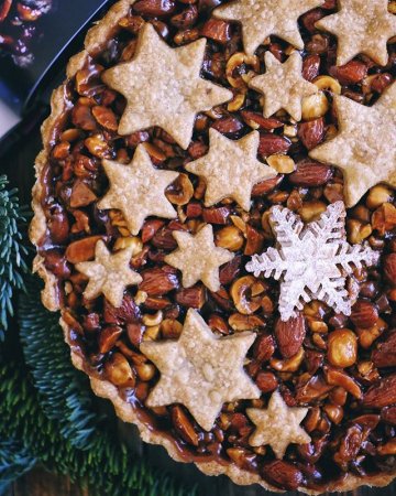 instagram.com/inn5775/ Ингредиенты (на форму 22 см): Для теста: 90 гр пшеничной муки80 гр ржаной муки1 ст. л. сахара1/4 ч. л. соли150 гр охлаждённого сливочного масла3-4 ст. л. ледяной воды Начинка: 380 гр смеси орехов (фундук, миндаль, грецкий)80 гр сливочного масла70 гр коричневого сахара 90 гр мёда2 ст. л. ложки сливок 33% жирности1/4 ч. л. соли instagram.com/inn5775/ Процесс приготовления:1. Приготовить тесто. Смешать оба вида муки, сахар и соль. Добавить масло и перетереть в крошку. Влить воду и быстро замесить тесто. Убрать в холодильник минимум на 1 час.2. На присыпанном мукой столе раскатать тесто толщиной 3 мм, перенести в форму, подрезать края и убрать в морозилку. Из остатков теста вырезать звездочки и также убрать в морозилку. 3. Тем временем приготовить начинку. Орехи подсушить в духовке при 160 градусах 15 минут, остудить и крупно порубить. Смешать в кастрюле масло, сахар, мёд, сливки и соль. Помешивая, довести до кипения, добавить орехи и снять с огня. Остудить до тёплого. 4. Выложить начинку на замороженную заготовку. Украсить звёздочками. Выпекать при 175 градусах 25-30 минут, пока начинка не начнёт пузыриться. Вынуть из духовки, дать полностью остыть. instagram.com/inn5775/