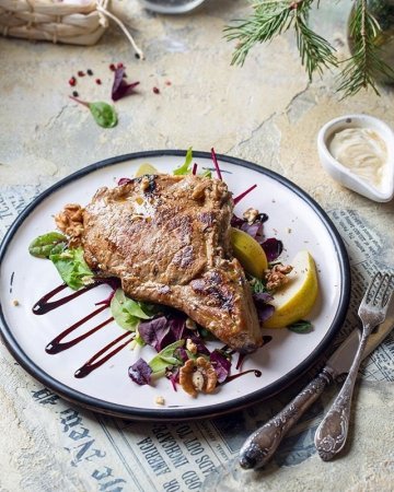 Процесс приготовления:Мясо:1. Мясо замариновать в смеси соевого соуса, оливкового масла, лимонного сока и тертого на мелкой тёрке чеснока на час (можно дольше).2. Обжарить лук с грибами в ложке оливкового масла, приправить щепоткой ароматных специей (тимьян, базилик, майоран, розмарин). 3. Каждый кусочек мяса разрезать горизонтально от края до кости. Положить на кусочек мяса грибную начинку, закрыть вторым кусочком мяса и скрепить края зубочистками.4. На хорошо разогретой сковороде обжарить мясо быстро с двух сторон до румяности. Завернуть мясо в фольгу, можно положить фольгу в форму, на неё мясо и сверху закрыть фольгой. Убрать на 15 минут в разогретую до 180 С духовку. Достать мясо и дать минут пять постоять. Убрать зубочистки. Подавать с салатом. Салат:Салат порвать руками, грушу порезать дольками. Выложить шапку из листьев, украсить грушами, грецкими орехами, сыром, полить маслом, уксусом и лимонным соком.