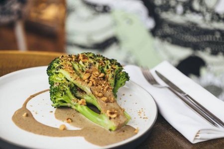 СТЕЙК ИЗ БРОККОЛИ 1. В кипящей подсоленной воде отвариваю брокколи/запекаю в духовке/или обжариваю на сковороде или гриле (как удобнее), разрезанную на длинные соцветия в течение 5-6 минут. Обдаю холодной водой, чтобы не потеряла цвет. 2. Смешиваю в миске лимонный сок, арахисовую пасту, соевый соус и хлопья острого перца. Добавляю мелко нарезанный острый перчик и достаточно горячей воды, чтобы получить соус желаемой консистенции. Подаю брокколи с ореховым соусом.