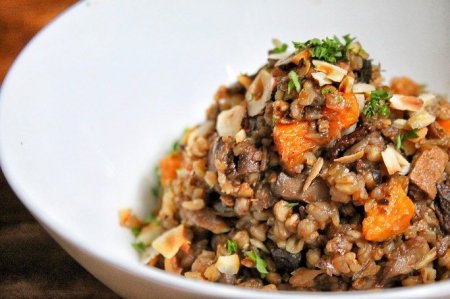 ГРЕЧКА С ГРИБАМИНа масле обжариваю 2 зубчика чеснока, добавляю нарезанные соломкой овощи (лук, морковь по 2-3 больших штуки) слегка обжариваю, туда же грибы, все это обжариваем, добавляем вареную гречку и укроп.