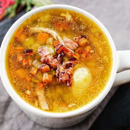 Автор фото и рецепта Евгения Смирнова: instagram.com/jennysmile83/ Ингредиенты: * Говяжьи ребра (можно взять мясо говядины на косточке) 500 гр* Варено-копченые свиные ребра 500 гр* Сухой горох 500 гр* Картофель 6 шт.* Лук репчатый 1 шт.* Морковь 1 шт.* Чеснок 3 зубчика* Сырокопченая грудинка 50 гр* Русская горчица 2 ст. л.* Соль, перец горошком по вкусу* Лавровый лист 1 шт.* Зелень Процесс приготовления: 1. Используйте зеленый колотый горох — он не требует предварительного замачивания. Если у вас обычный сухой горох, то его нужно промыть и залить холодной водой на 4-5 часов.2. Говяжьи ребра (или просто кусок говядины на косточке) промыть, положить в кастрюлю (3-х литровую) и залить холодной водой.3. Копчёные ребра промыть, разделить на отдельные сегменты (ребрышки) и поместить в кастрюлю.4. Довести до кипения и варить на медленном огне 1-1,5 часа. Как понять, что ребра готовы? Мясо от них легко отходит.5. Ребра вынуть, снять с них мясо и нарезать его мелкими кусочками. 6. Довести бульон до кипения, всыпать в него горох и варить 30 минут.7. 4 картофелины нарезать крупным кубиком, а 2 картофелины оставить целыми. Положить картофель в суп и варить 20 минут.8. За это время морковь и лук нарезать мелким кубиком и обжарить на растительном масле до золотистого цвета.9. Положить лук, морковь и нарезанное мясо в суп, варить еще 10 минут.10. Добавить перец горошком, лавровый лист и соль (по вкусу).11. Вынуть целые картофелины, размять их вилкой, вернуть пюре в суп.12. В конце добавить горчицу, нарезанный мелко чеснок и нарезанную на длинные узкие кусочки грудинку, можно добавить зелень.13. Прогреть суп 3-5 минут.14. Дать супу настояться полчаса и подать горячим непременно с ржаным свежим хлебом, чесноком и горчицей.