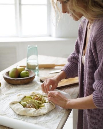 instagram.com/marikakravtsova/ Ингредиенты: Корж:?Мука около 1,5 стаканов, часть можно заменить миндальным жмыхом?1 ч. л. корицы?1 ст. л. кокосового сахара?7 ст. л. (около 100 гр) сильно охлаждённого тёртого сливочного масла (если не едите, используйте кокосовое)?5-7 ст. л. ледяной воды?Начинка:?3-4 небольших плотных груши?1/3 чашки клюквы (по желанию)?3 ст. л. кокосового сахара?1 ч. л. корицы?Мускатный орех на кончике ножа?Сок половинки лимона?1 ст. л. кукурузного крахмала?2 ст. л. раскрошенного пекана (не повредит, но можно и без)?Дополнительно:?молоко для смазывания теста?сахарная пудра для украшения Процесс приготовления: 1. В большой миске смешать сухие ингредиенты.2. Быстро натереть масло и с помощью миксера смешать с сухими ингредиентами до образования крупинок с горошину.3. Добавлять по одной столовой ложке воды, вмешивая её в смесь лопаткой.4. Оперативно проработать тесто руками до однородности.5. Завернуть тесто в пищевую пленку, формируя диск, убрать в холодильник на час.?Пока тесто охлаждается, готовим начинку:6. Тонкими лепестками нарезать грушу (сердцевина не нужна).7. Хорошенько смешать все ингредиенты в большой миске (дать постоять, чтобы груша пропитались специями).?Дальше:8. Разогреть духовку до 220 градусов.9. Вынуть тесто из холодильника.10. Припудрить скалку мукой, тонко раскатать тесто, ориентируясь на выбранную форму.11. Выложить начинку на тесто, на 4 см оставляя свободными края.12. Подвернуть края теста, как на фото.13. Смазать подвёрнутое тесто молоком и чуть присыпать кокосовым сахаром.14. Выпекать 20-25 минут.