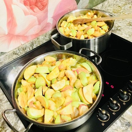 «Яблоки обильно пересыпала сахаром и ушла по делам на семь часов, они за это время уже купались в сиропе и я поставила яблоки томиться на небольшой огонь. Мне было тоскливо и лень, поэтому я иногда подходила и вяло их помешивала. За минуту бросила лимонную цедру, корицу и ваниль.»