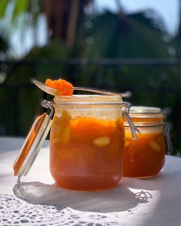 Instagram.com Ингредиенты (примерно на 1 литр варенья): Абрикосы — 1 кг Сахар — 300 гр Гость очищенного белого миндаляСок 1 лаймаМиндальнаяПектин яблочный — 25 грНа 8 кг абрикосов у меня ушла баночка миндальной эссенции — 20 мл Процесс приготовления: 1. Абрикосы аккуратно разорвать пополам, вынуть косточки. 2. Тщательно смешать пектин с 1/3 сахара. Всыпать в абрикосы сахар с пектином, перемешать. Оставить на пару часов. Пусть пустят сок.3. Оставшийся сахар развести (примерно 100 мл воды на кило сахара) в кастрюле, влить сок лайма и на среднем огне сварить сироп.4. Залить сиропом абрикосы, добавить миндаль, влить эссенцию и довести до кипения на среднем огне.5. Варить минут 5-8, следите, чтобы половинки абрикосов остались достаточно плотными и не расползались в пюре, но не были бы твердыми.6. Сразу разложить абрикосы по горячим стерилизованным банкам, залить кипящим сиропом.7. Закрыть крышками. Накрыть полотенцем и дать остыть.Мне, несмотря на небольшое количество сахара, оно показалось слишком сладким (спасибо, прованское солнце) — добавила ещё чайную ложку (без горки) лимонной кислоты. Это на 8 кг.