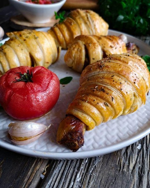 Автор фото и рецепта Рене: Ингредиенты: • голени куриные 6 шт• тесто слоеное бездрожжевое 1 пласт• желтокДля маринада:• соевый соус 70 мл• копченая паприка 1 ч.л.• чеснок сушеный 1 ч.л.• перце свежемолотый щепотка• паприка сладкая 1 ч.л.• куркума 1 члДля соуса• томат 1 шт• чеснок 2 зубчика• петрушка, базилик по вкусу Процесс приготовления: 1. Ножки промыть, обсушить бумажным полотенцем.2. Для маринада все ингредиенты смешать. Залить ножки. Забыть минут на 15-20.3. За это время подготовить тесто. Заранее его нужно разморозить. Раскатать пласт толщиной 3 мм. Нарезать по длине на полосочки шириной в 1,5 см.4. Ножки обжарить по 2-3 минуты на сильном огне до аппетитной корочки. Остудить немного. Каждую ножку «забинтовать» тестом. Каждую новую полоску склеивать с предыдущей или делать внахлест.5. Смазать тесто взбитым желтком. Можно посыпать кунжутом или приправой, например, смесью итальянских трав.6. Отправить в разогретую до 180С духовку на 30 минут. 7. Для соуса запечь минут 20 в разогретой до 200С духовке томат и 2 зубчики чеснока, не очищая их. Затем снять кожицу с томата и чеснока и взбить блендером вместе с петрушкой и базиликом, смотря, что есть или можно взять сушеные.