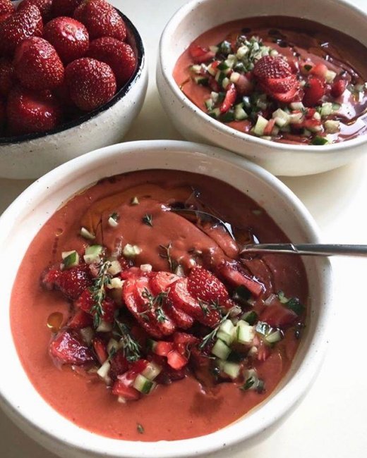Гаспачо Ингредиенты: ?2 небольших сладких помидора?3 огурца?1 маленький болгарский перец?половинка лука-шалота (по желанию)?1/2 кг клубники?1 долька чеснока?2 веточки тимьяна?3 ст.л. оливкового масла?1 ст.л. бальзамического уксуса?Соль, перец Гаспачо Процесс приготовления: 1. В блендер бросаем помидоры, клубнику, 2 огурца, чеснок, шалот. Солим, перчим, добавляем уксус, масло, тимьян и полстакана воды и взбиваем все до однородной массы. Режем оставшийся огурец и немного клубники для украшения.?2. Суп выливаем в красивую тарелку, сверху выкладываем наш огуречно-клубничный тартар. Украшаем веточкой тимьяна. Сбрызгиваем капелькой масла и бальзамиком для красоты. И будет здорово, если перед подачей суп постоит в холодильнике, чтобы настоялся и был освежающе холодным.