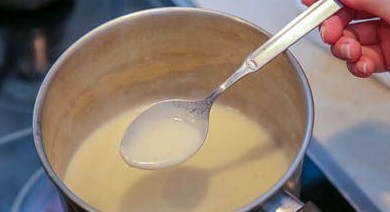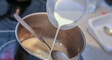 Постепенно, тонкой струйкой влить молоко, постоянно помешивая.