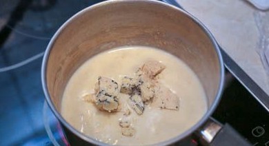 Как только смесь начнет закипать, добавить сыр стилтон, предварительно раскрошив его на кусочки. Варить соус, помешивая, пока сыр не расплавится. Приправить по вкусу, если хотите, но и без каких-либо добавок, этот сырный соус получается вкусным. Приятного аппетита!