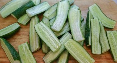 Молодые огурцы промыть под проточной водой, при необходимости залить холодной водой и оставить на несколько часов. Разрезать каждый пополам.