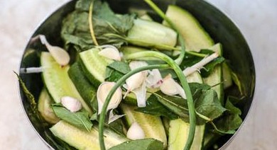 Следом уложить огурцы, распределить на них оставшуюся зелень и порезанный пластинами чеснок.