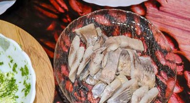 Все ингредиенты для закуски подготовить на столе. Хлеб лучше всего взять уже порезанный. Сельдь порезать на кусочки толщиной не более 2 см.
