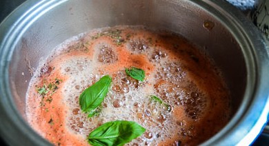 Довести до кипения, добавить по вкусу соли и сахара, а также листики зеленого базилика. Отставить пока с плиты.