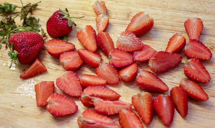 Клубнику вымыть, удалить чашелистики. Каждую ягоду разрезать пополам или на четвертинки, если клубника очень крупная.
