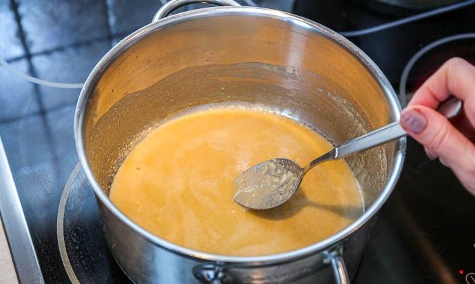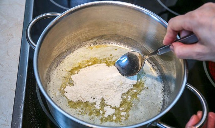В кастрюле на слабом огне растопить кусочек сливочного масла (30г), добавить муку и, помешивая, готовить, пока мука не приобретёт золотистый цвет.