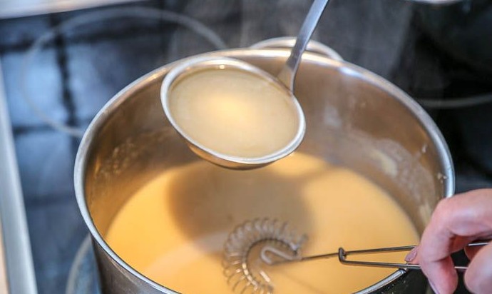 Продолжая размешивать венчиком, по ковшику вливать бульон, затем увеличить огонь до среднего и, продолжая размешивать, довести бульон до кипения.