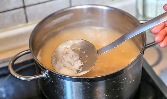 Уменьшить огонь и варить, снимая шумовкой пену, около 40 минут.
