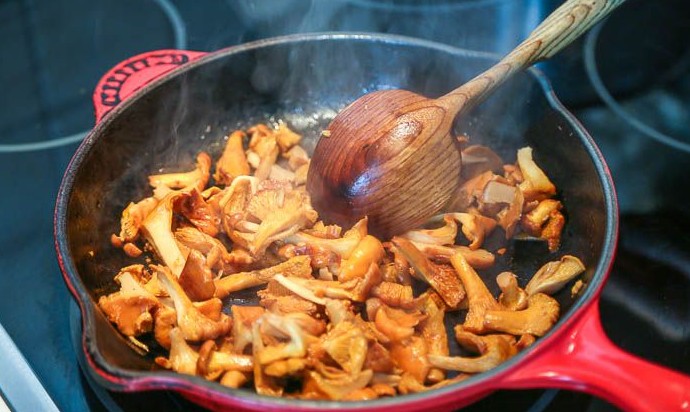 Пока готовится основа для супа, растопить в сковороде сливочное масло (50г) и обжаривать подготовленные очищенные, нарезанные лисички.