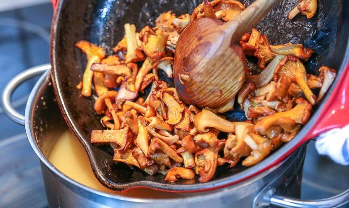 Для сливочного супа велюте с лисичками сначала готовят ру (roux). Это такая хорошо прогретая, до приятной кремовости мука на сливочном масле. Французы так частенько делают, чтобы придать супам бархатистость. Лисички просто обжаривают на сливочном масле и добавляют вместе со сливками в полуготовый кремовый суп. Просто и вкусно.