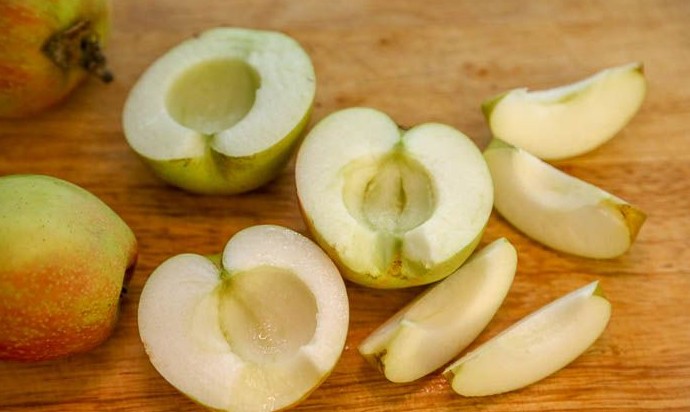 Яблоки вымыть, разрезать пополам, вырезать сердцевину, а затем каждую половинку порезать на дольки. Кожицу с яблок можно не срезать.