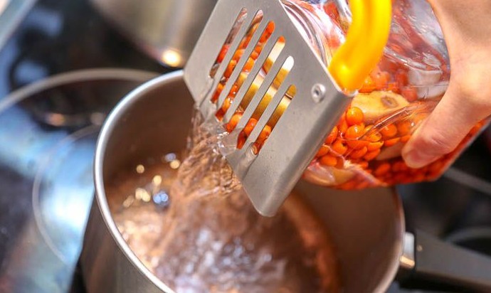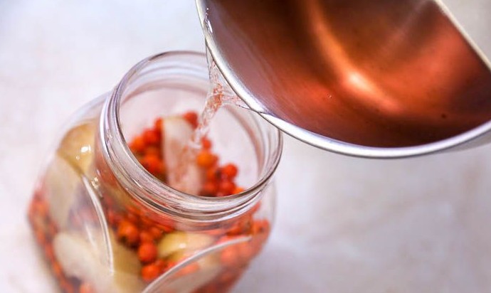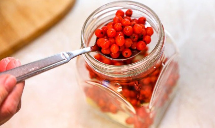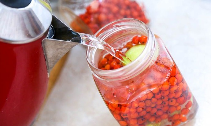 После этого разложить рябину и яблоки по подготовленным промытым и простерилизованным банкам.