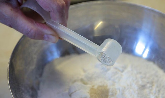 В муку добавить сухие дрожжи. Я использую те, которые сразу смешивают с мукой.