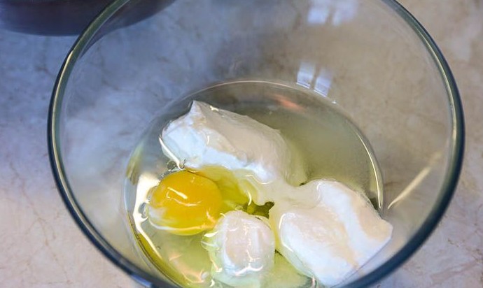 В отдельной посуде смешать венчиком сметану, сырое яйцо, растительное масло, сахар и соль.