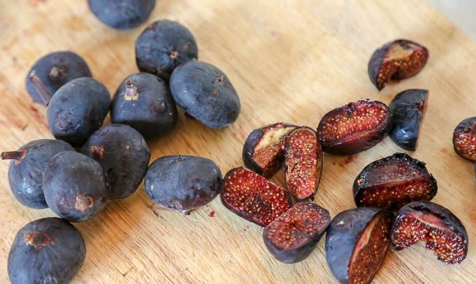 Инжир вымыть под проточной холодной водой, обсушить на бумажных полотенцах и порезать каждую ягоду пополам или на четвертинки.