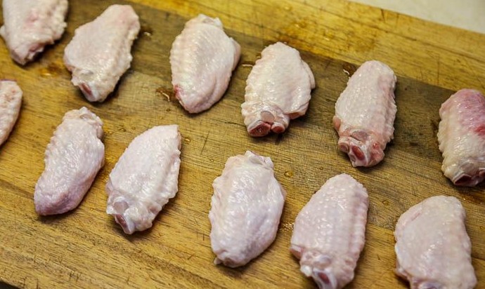 Крылышки промыть под проточной холодной водой, обсушить на бумажном полотенце, отрезать кончики в области последнего сустава (их можно выбросить или убрать в морозилку для бульона). Оставшуюся часть крыла разрезать на 2 части по суставу.