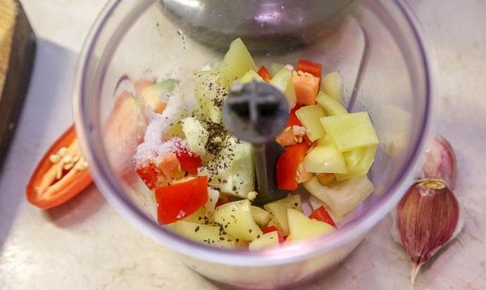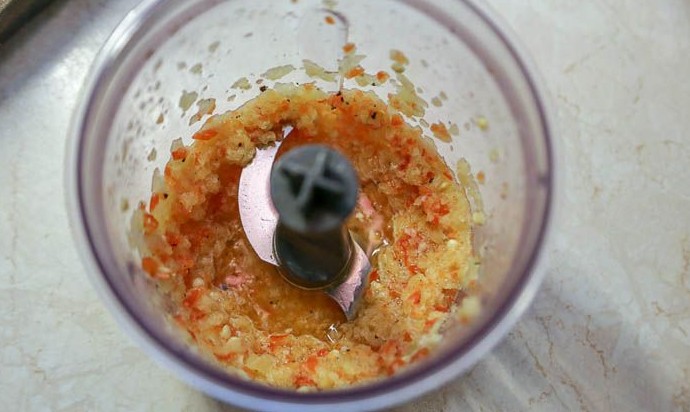 Для маринада перец чили разрезать вдоль, удалить перегородку и семена (семена можно оставить, если хотите маринад поострее). То же самое проделать со сладким перцем. Чеснок очистить, раздавить лезвием ножа, после чего мелко нарезать. Перцы и чеснок сложить в чашу блендера, добавить соль, орегано.