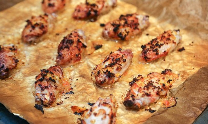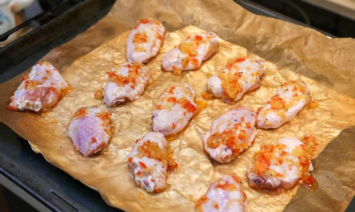 Разложить куриные крылышки на противне. Будет правильнее накрыть противень пекарской бумагой, тогда его проще будет мыть.