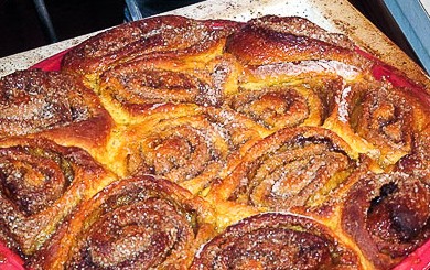 Когда тесто подошло, подпылила стол мукой, раскатала тесто в пласт толщиной 0,5см. Смазала всю поверхность растопленным сливочным маслом. Сверху рассыпала сахар, перемешанный с корицей. Свернула тесто плотным рулетом, нарезала на шайбы толщиной 3-4см. Уложила их в форму вертикально. Дала расстояться минут 30. Выпекала при 180C. минут 30-40.
