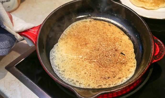 Разогреть сковороду (диаметром около 20 см), смазать небольшим количеством растительного масла и влить половник теста. Распределить тесто по дну сковородки тонким слоем, уменьшить нагрев до среднего (или даже ниже среднего) и жарить блин, пока на его поверхности не появятся «кратеры».