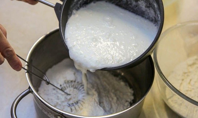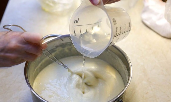 Продолжая перемешивать тесто венчиком, влить 160 мл кипятка.