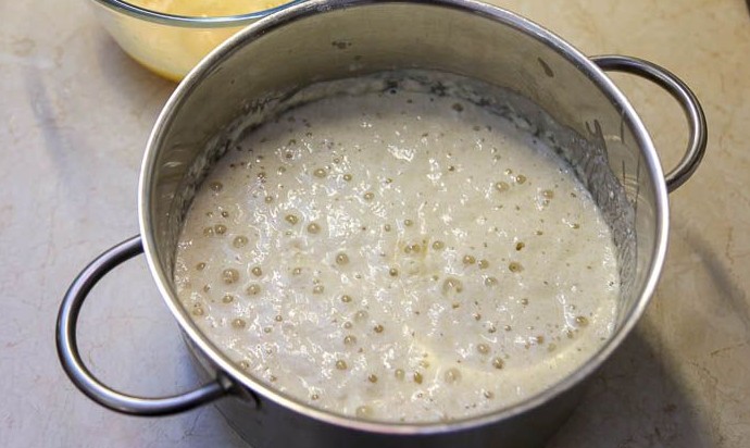 Через 40 минут тесто запузырится и увеличится в объеме минимум в 2 раза.