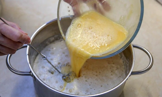 Теперь надо добавить в тесто яйца. Для этого в отдельно миске надо размешать сырые яйца вилкой или венчиком, и только после этого вылить их в тесто.