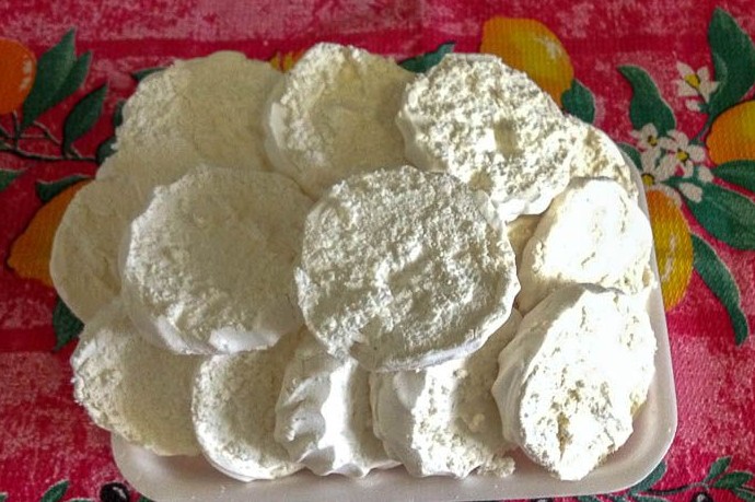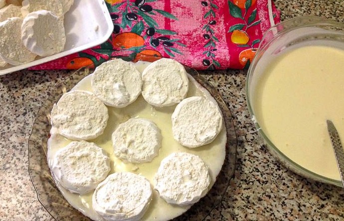 Для крема взбить жирную сметану со сгущенкой. Для прослойки торта готовый зефир разрезать пополам.