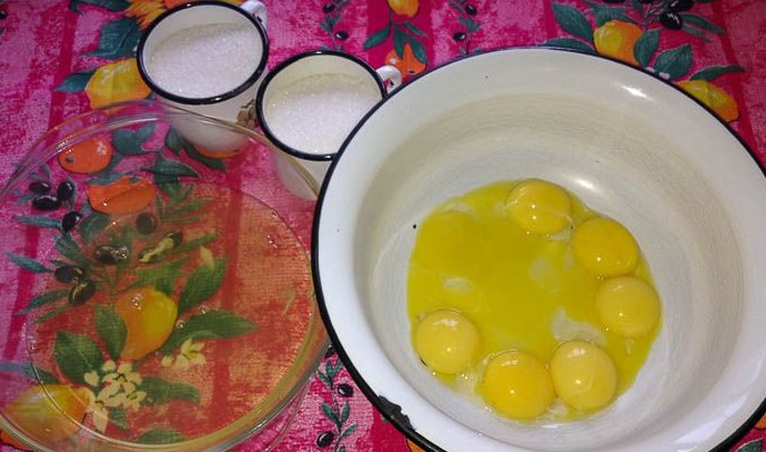 Желтки растереть с половиной сахарного песка добела. Белки взбить с остальным сахаром до устойчивых пиков.