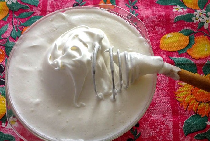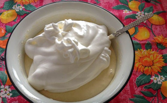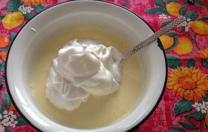 В миску с растертыми с сахаром желтками аккуратно примешать треть взбитых белков.